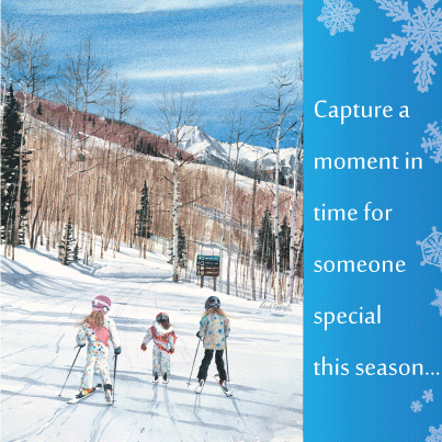 Provide a photograph of you or your loved ones skiing or snowboarding and Linda will paint an original watercolor of that photograph. And, if you'd like to share your painting with friends or family members, contact us about having prints or note cards made from the original!